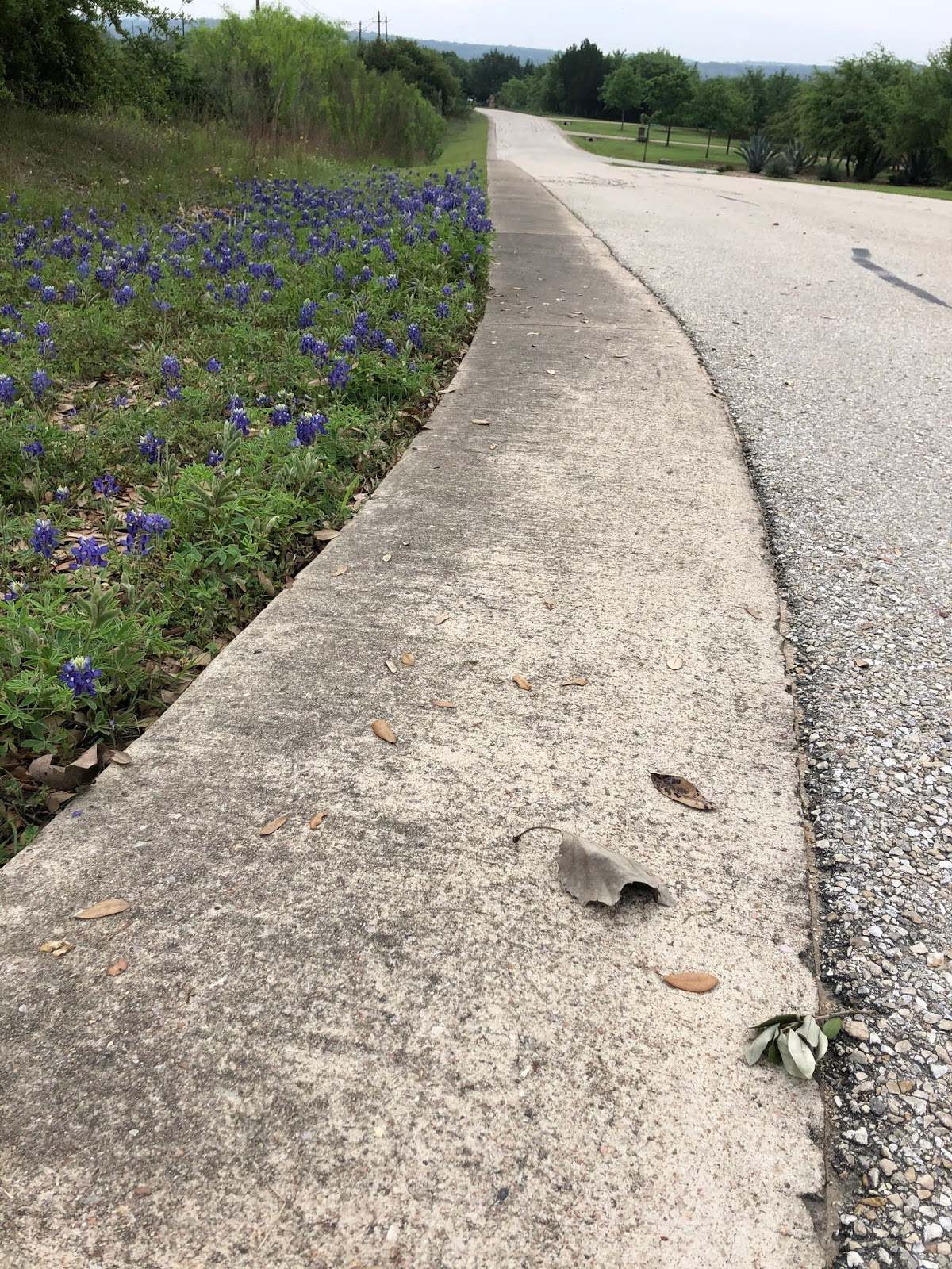 Follow.Instead of the road, I was called upon the asphalt pavers that framed the menagerie of roadways in this subdivision system. Again, typically I would have taken the path of least resistance and distance and followed the tangents. Not today. I was the chosen one to heed the call of the 18" wide pavers as they created the boundary of each side of the road. They felt like the "yellow brick road" but their dismal pattern and color was not so revealing. But they did a lovely job shape forming the main roads. If a road intersected, the pavers snaked their way around the corner, guiding to the end of the road, then gently encircled the culdesac to reveal themselves on the opposite side and continue their journey back to the main road. In this area, they were a perfect never-ending "frame" that roamed the entire property moving from the main road, around smaller side roads, back to the main road, up hill, down hill, dead ends, to the end of the property and then providing the same experience on the return route. And if followed, one would have gone down, around, in and out every roadway in the subdivision on the "never ending or stopping" concrete pavers. Absolutely the path of the farthest distance - running the boundaries of the entire system.